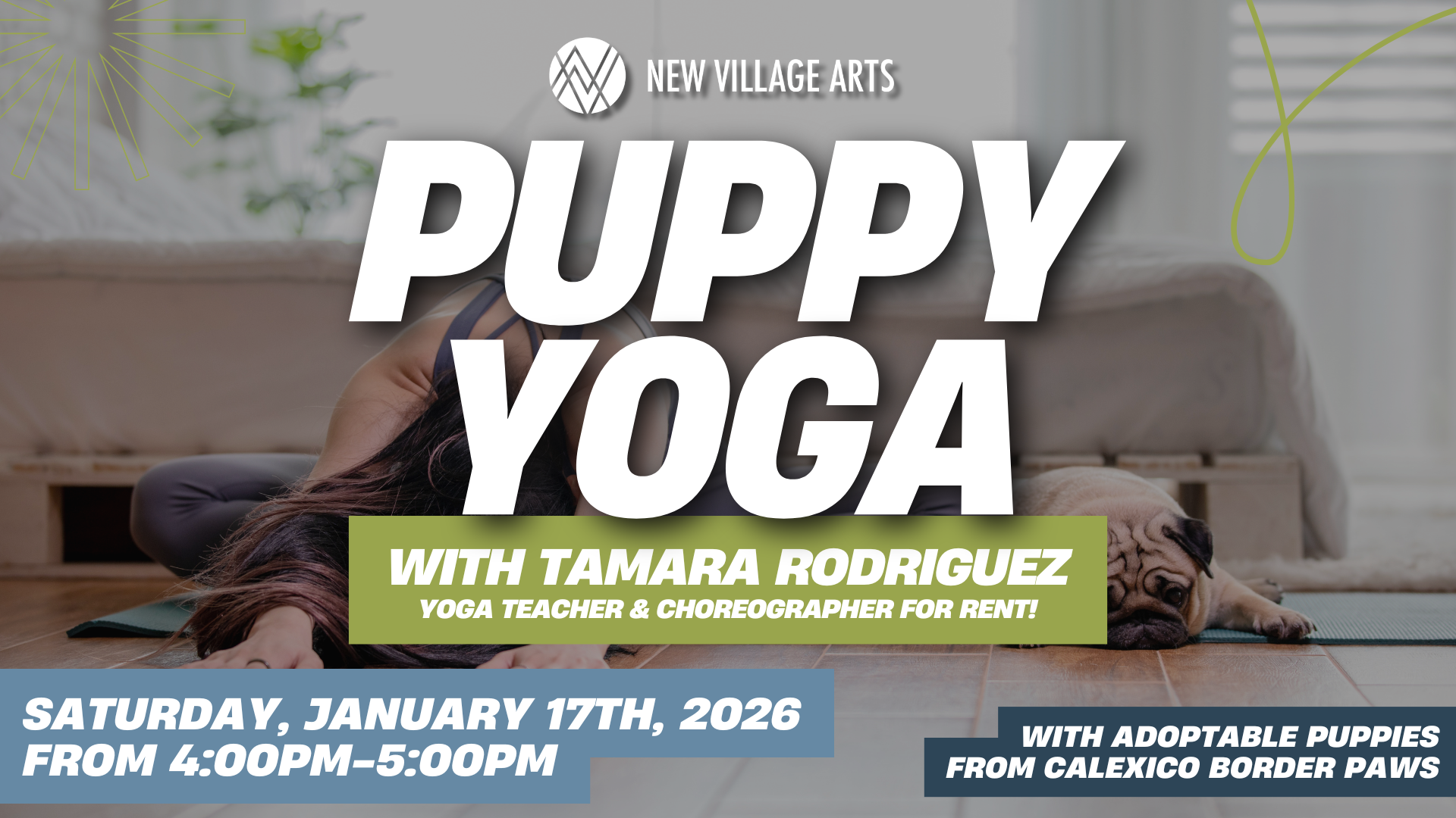 Beginner-friendly yoga class featuring adorable, adoptable puppies from Calexico Border Paws Rescue!